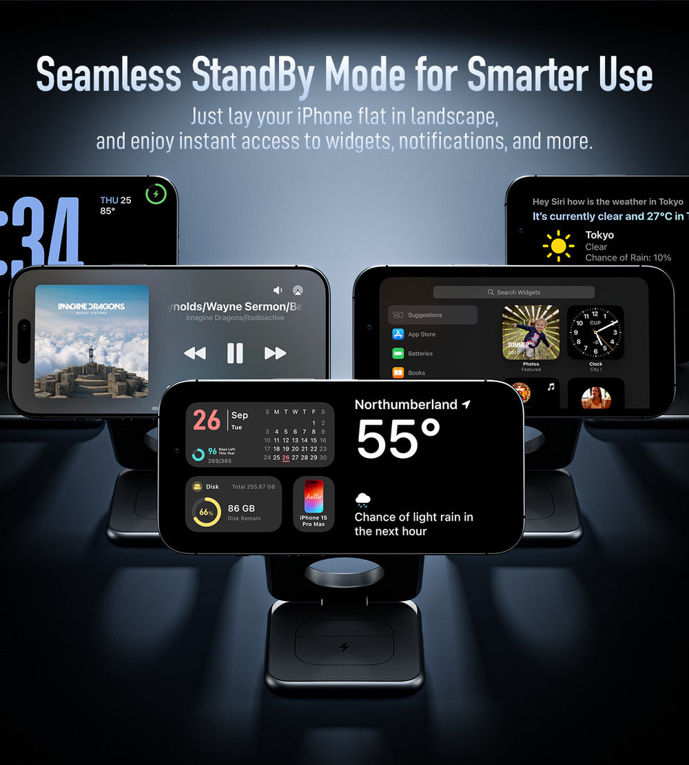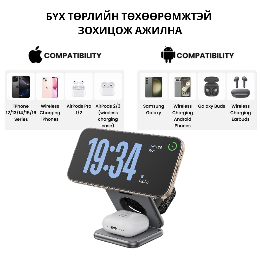 Бүх төхөөрөмжийг нэг дор хурдан Qi цэнэглэнэ. IPhone, Samsung, Huawei гэх мэт бүх Qi дэмждэг төхөөрөмжүүдтэй нийцнэ. Орчин үеийн, Эвхэгддэг дизайн нь гэртээ эсвэл ажилдаа авч явахад тохиромжтой.
