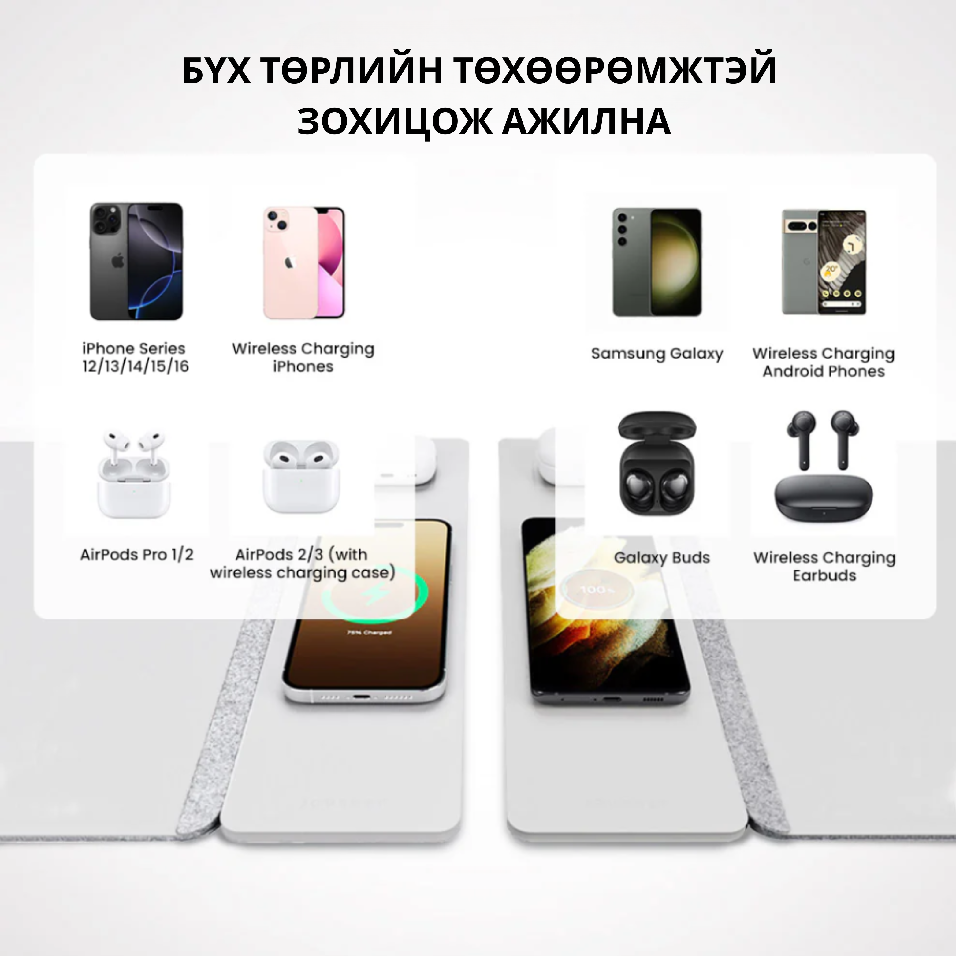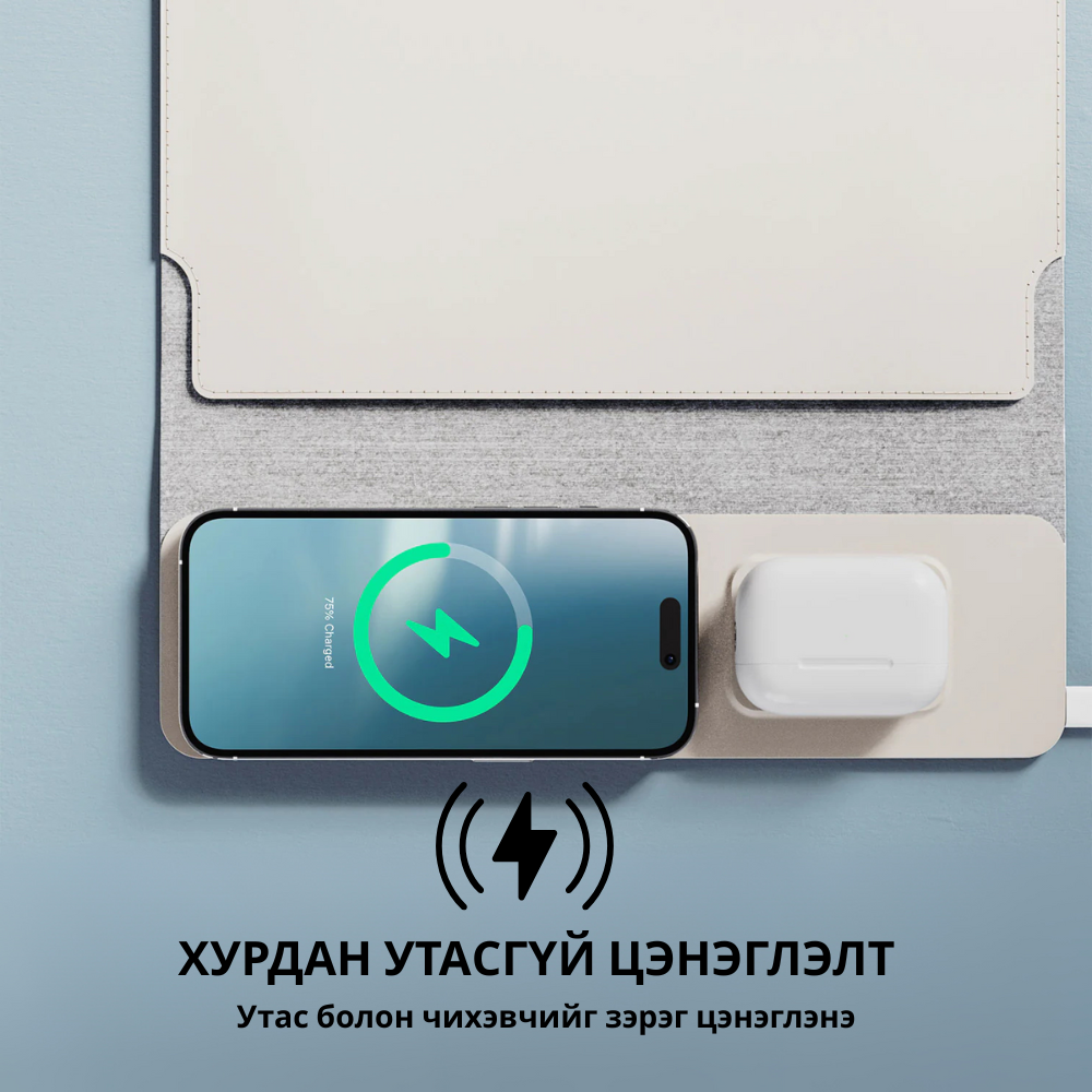 Apple AirPods, iPhone, Samsung болон бусад утаснуудыг утасгүйгээр хурдан цэнэглэнэ. Завгүй ажилтай хүмүүст хаана ч ашиглахад тохиромжтой.
